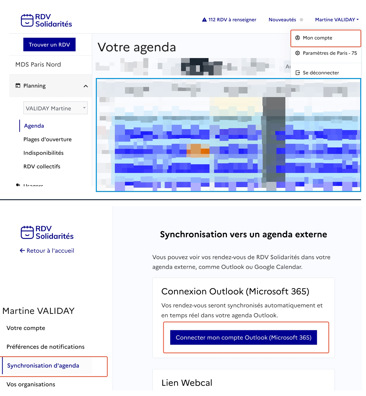 Étape 2 : Une fois connecté·e sur RDV Service Public, l’administrateur·ice doit cliquer sur son nom en haut à droite > Mon Compte > Synchronisation d’agenda > Connexion Outlook > Se connecter avec Microsoft